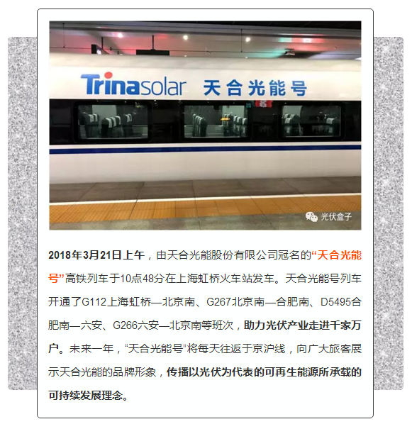 2018年3月21日上午,由天合光能股份有限公司冠名的“天合光能號”高鐵列車于10點48分在上海虹橋火車站發(fā)車。天合光能號列車開通了G112上海虹橋—北京南、G267北京南—合肥南、D5495合肥南—六安、G266六安—北京南等班次,助力光伏產(chǎn)業(yè)走進千家萬戶。未來一年,“天合光能號”將每天往返于京滬線,向廣大旅客展示天合光能的品牌形象,傳播以光伏為代表的可再生能源所承載的可持續(xù)發(fā)展理念。